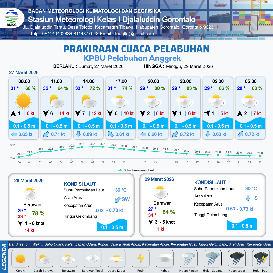 27 Mar 26, 18.00 3 jam kedepan | Barat Daya 1 kt Gust Peningkatan kecepatan angin yang singkat dan tiba-tiba : 5 kt | 0.2 m Tenang | Selatan 0.6 Knot | 10 km | 29 °C | 86 % | -0.12 m | |