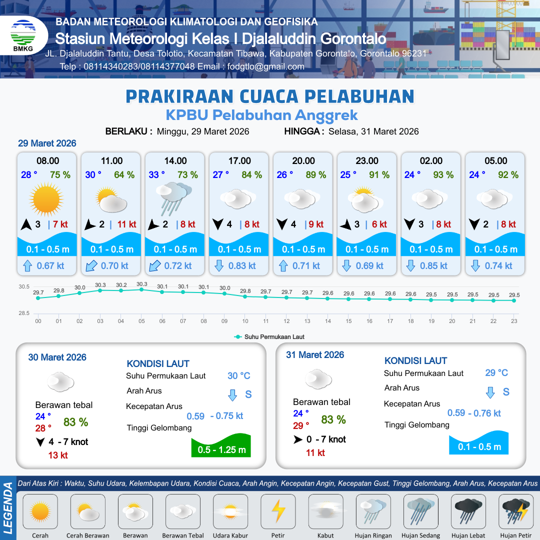 29 Mar 26, 05.00 2 jam kedepan | Timur Laut 2 kt Gust Peningkatan kecepatan angin yang singkat dan tiba-tiba : 12 kt | 0.5 m Rendah | Barat 0.7 Knot | 10 km | 31 °C | 78 % | +0.16 m | |