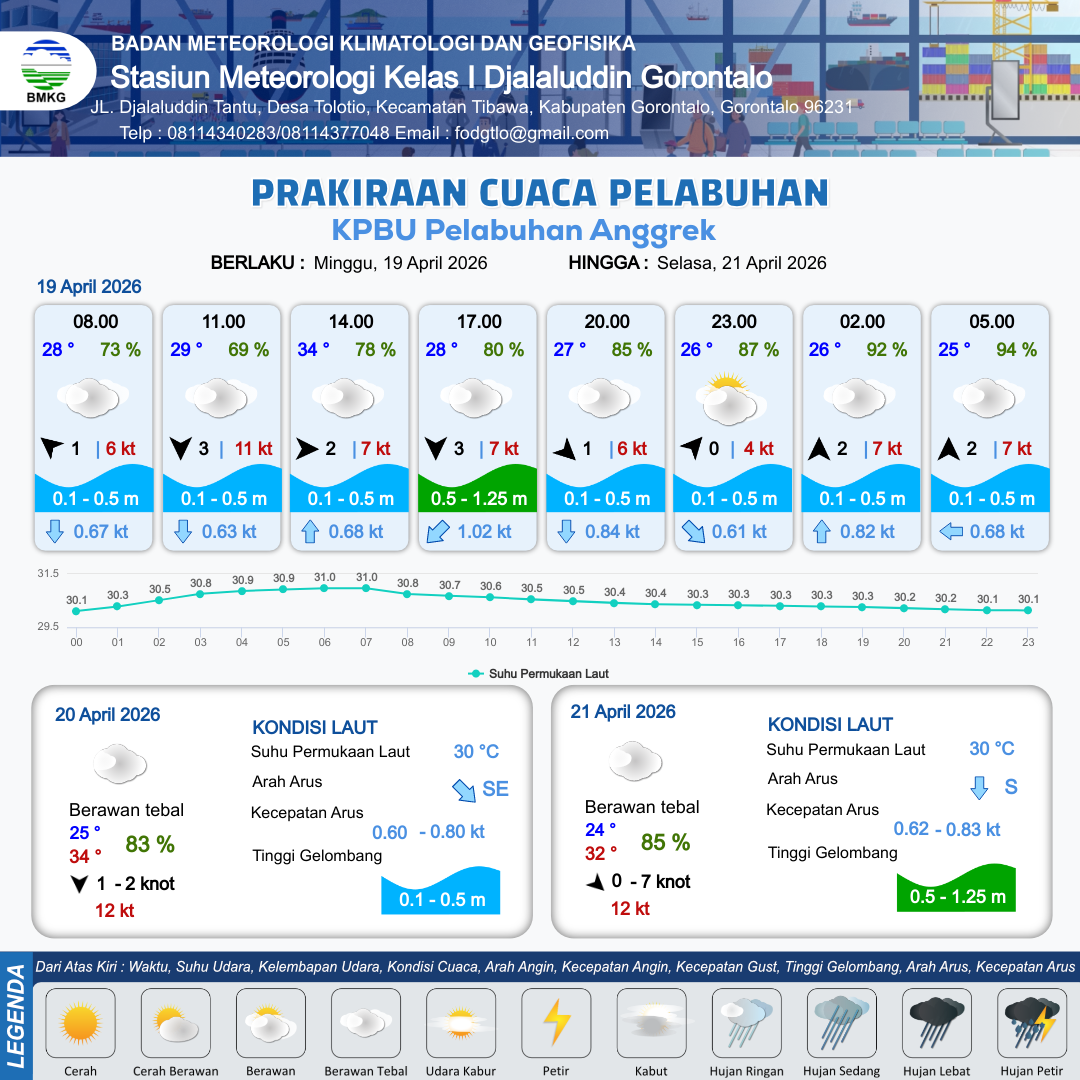 17 Apr 26, 07.00 13 jam yang lalu | Berawan Tebal | Utara 6 kt Gust Peningkatan kecepatan angin yang singkat dan tiba-tiba : 12 kt | | | 10 km | 30 °C | 73 % | +0.62 m |