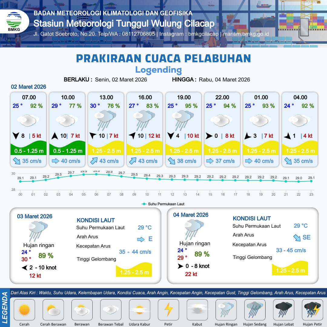 2 Mar 26, 16.00 2 jam kedepan | Barat 0 kt Gust Peningkatan kecepatan angin yang singkat dan tiba-tiba : 6 kt | 2 m Sedang | Timur 39.0 cm/s | 8 km | 25 °C | 94 % | +0.15 m | |