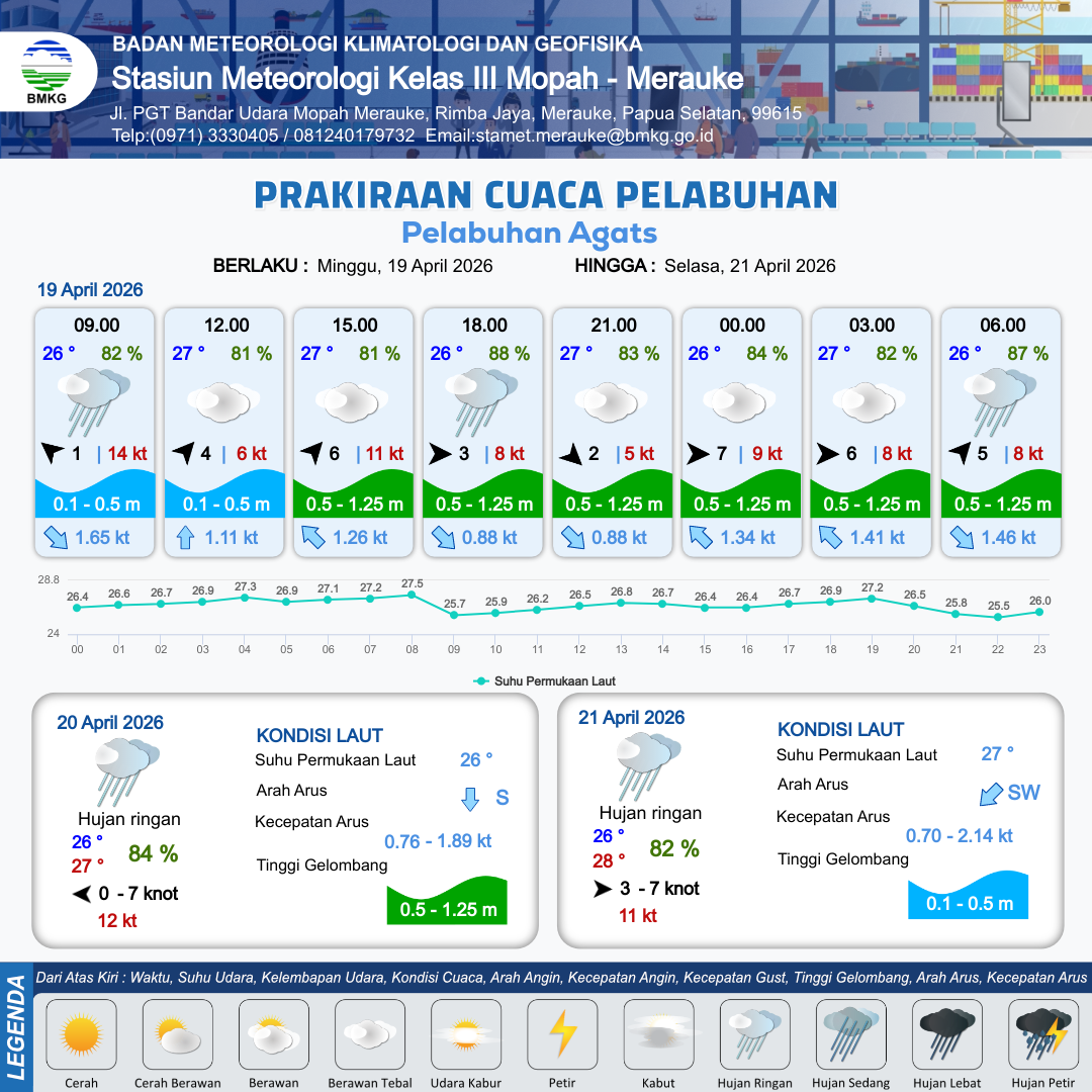 18 Apr 26, 22.00 4 jam kedepan | Hujan Ringan | Barat Daya 7 kt Gust Peningkatan kecepatan angin yang singkat dan tiba-tiba : 13 kt | | | 4 km | 26 °C | 85 % | +0.72 m |