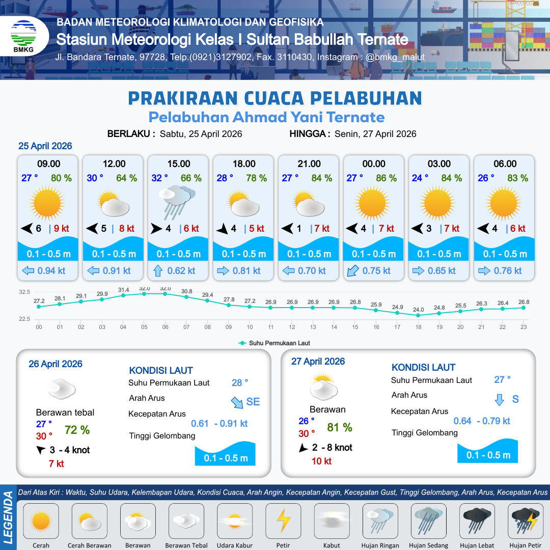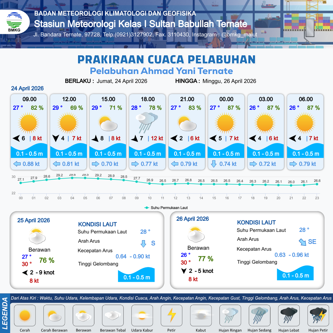 23 Apr 26, 23.00 3 jam kedepan | Cerah Berawan | Timur 5 kt Gust Peningkatan kecepatan angin yang singkat dan tiba-tiba : 9 kt | | | 10 km | 26 °C | 87 % | +0.24 m |