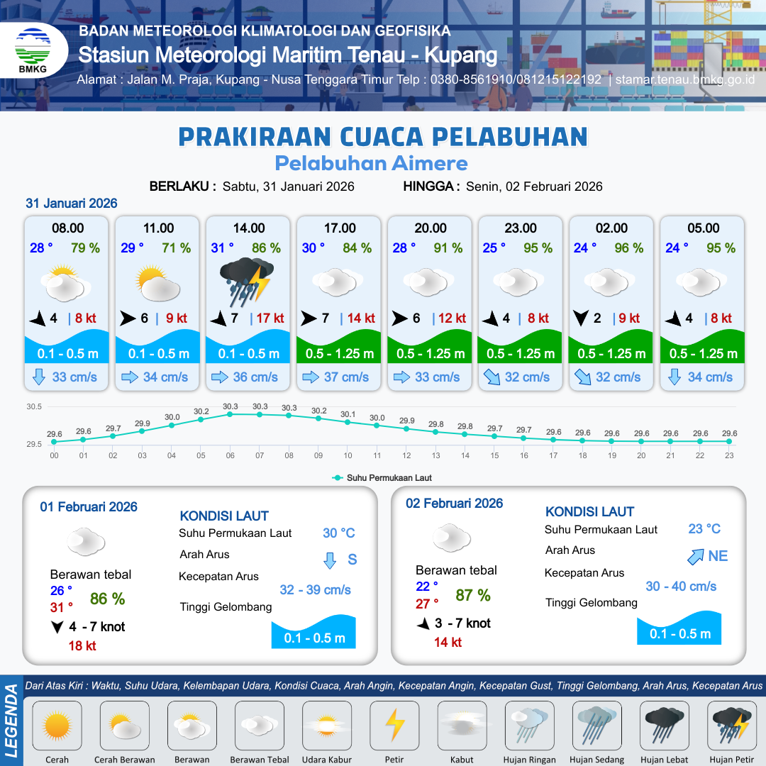 31 Jan 26, 10.00 9 jam yang lalu | Berawan | Barat 7 kt Gust Peningkatan kecepatan angin yang singkat dan tiba-tiba : 10 kt | | | 10 km | 30 °C | 86 % | +0.30 m |