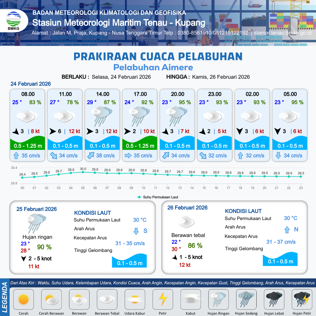 24 Feb 26, 09.00 2 jam kedepan | Barat 2 kt Gust Peningkatan kecepatan angin yang singkat dan tiba-tiba : 10 kt | 0.6 m Rendah | Timur 35.0 cm/s | 8 km | 24 °C | 92 % | +0.67 m | |
