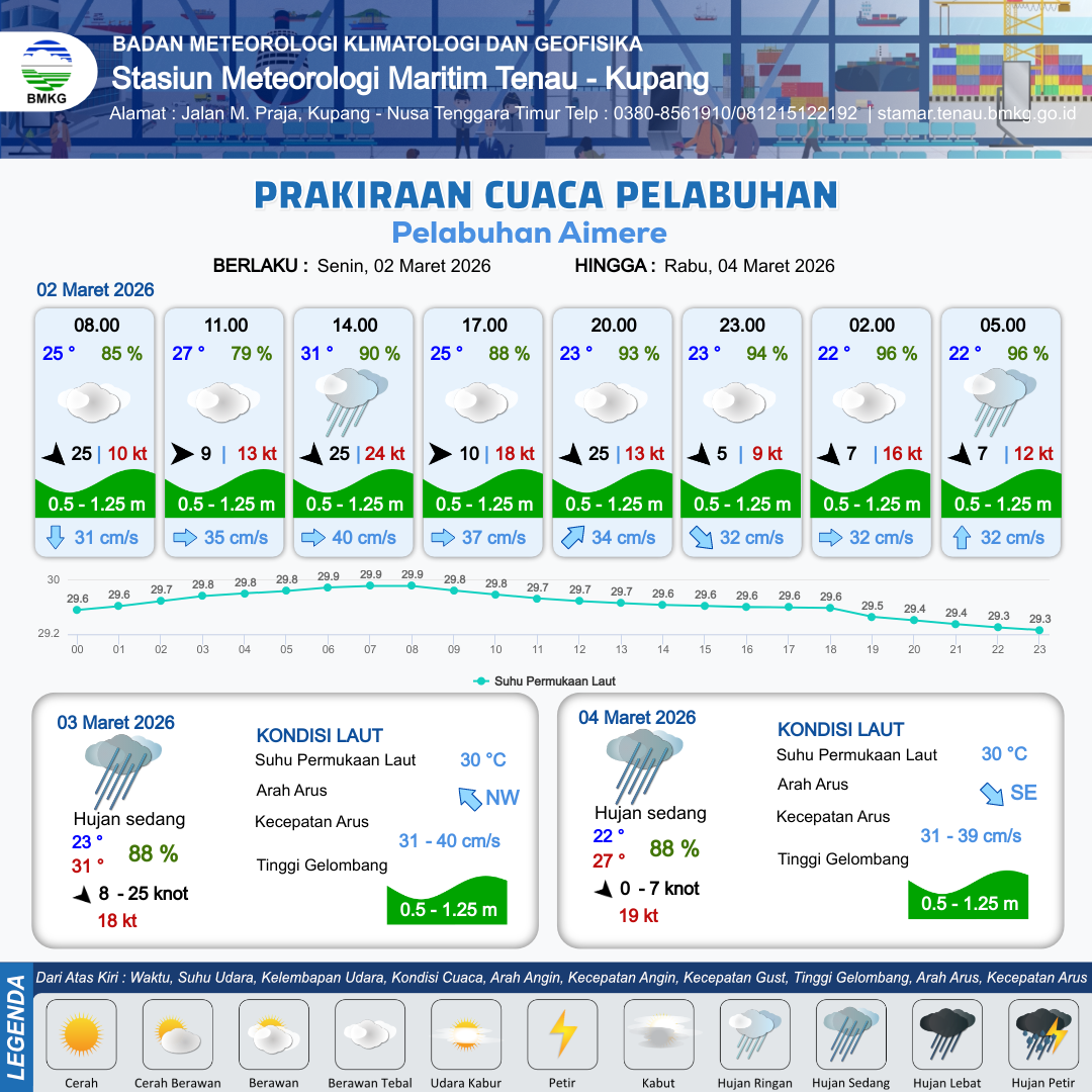 2 Mar 26, 18.00 3 jam kedepan | Barat Laut 7 kt Gust Peningkatan kecepatan angin yang singkat dan tiba-tiba : 16 kt | 0.7 m Rendah | Timur 32.0 cm/s | 8 km | 22 °C | 96 % | -0.18 m | |