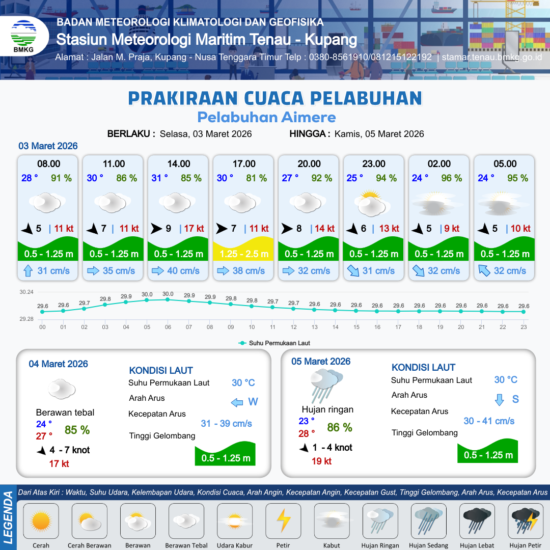 3 Mar 26, 21.00 5 jam kedepan | Barat Laut 5 kt Gust Peningkatan kecepatan angin yang singkat dan tiba-tiba : 10 kt | 0.7 m Rendah | Barat Laut 32.0 cm/s | 1 km | 24 °C | 95 % | -1.17 m | |