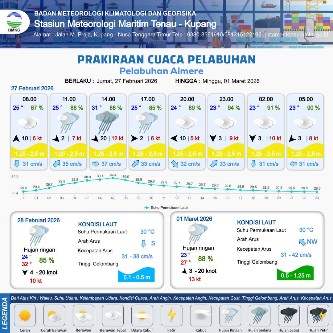 27 Feb 26, 06.00 1 hari 1 jam yang lalu | Barat Laut 20 kt Gust Peningkatan kecepatan angin yang singkat dan tiba-tiba : 12 kt | 1.5 m Sedang | Timur 37.0 cm/s | 5 km | 31 °C | 88 % | -0.02 m | |