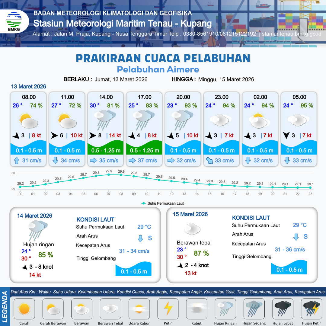 13 Mar 26, 05.00 16 jam yang lalu | Barat 8 kt Gust Peningkatan kecepatan angin yang singkat dan tiba-tiba : 13 kt | 0.5 m Rendah | Timur 33.0 cm/s | 8 km | 29 °C | 78 % | +0.26 m | |
