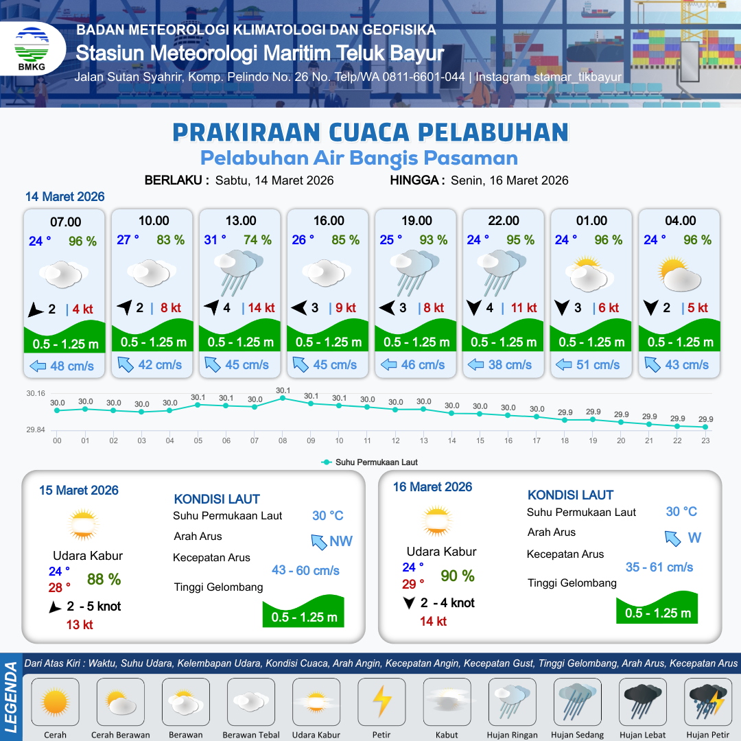 14 Mar 26, 23.00 17 jam kedepan | Timur Laut 4 kt Gust Peningkatan kecepatan angin yang singkat dan tiba-tiba : 5 kt | 0.6 m Rendah | Barat 50.0 cm/s | 5 km | 24 °C | 97 % | -0.17 m |