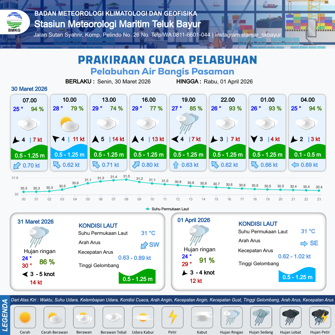 30 Mar 26, 23.00 20 jam kedepan | Timur 3 kt Gust Peningkatan kecepatan angin yang singkat dan tiba-tiba : 6 kt | 0.5 m Rendah | Selatan 0.6 Knot | 8 km | 25 °C | 96 % | +0.08 m |