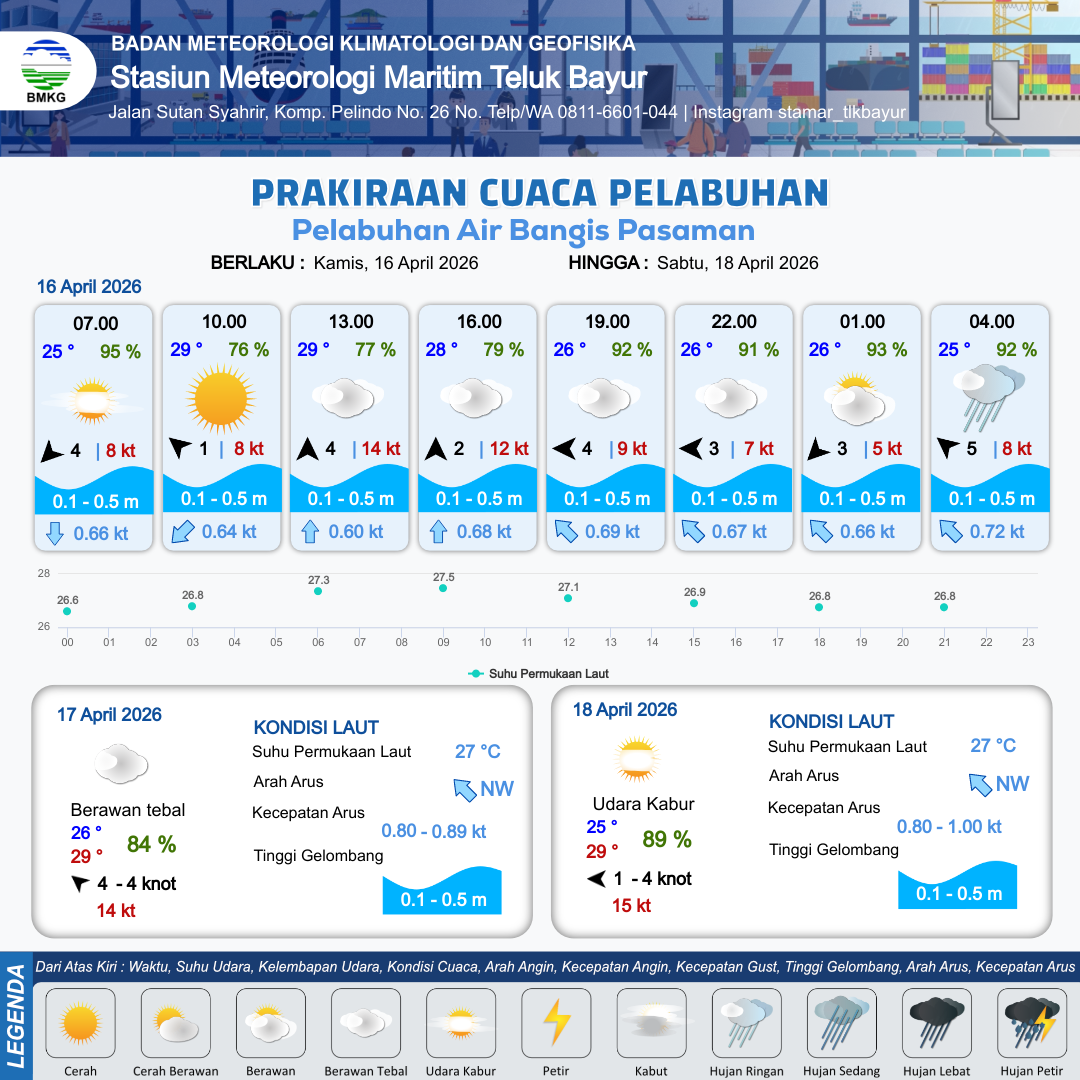 17 Apr 26, 18.00 19 jam kedepan | Utara 2 kt Gust Peningkatan kecepatan angin yang singkat dan tiba-tiba : 3 kt | 0.4 m Tenang | Barat Laut 0.8 Knot | 8 km | 26 °C | 93 % | +0.49 m | |