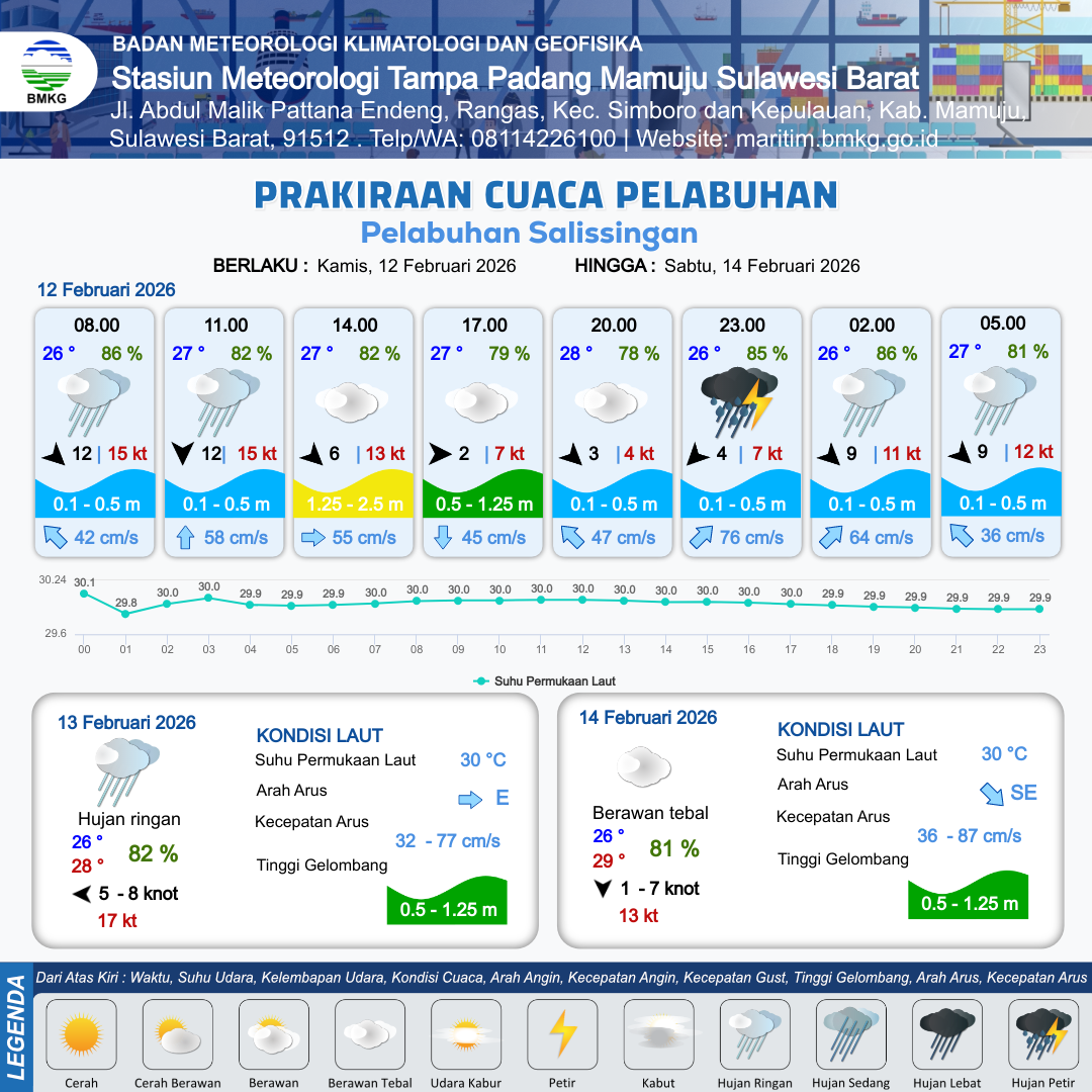 12 Feb 26, 14.00 7 jam kedepan | Barat 8 kt Gust Peningkatan kecepatan angin yang singkat dan tiba-tiba : 4 kt | 0.7 m Rendah | Timur Laut 64.0 cm/s | 10 km | 27 °C | 80 % | +0.11 m | |
