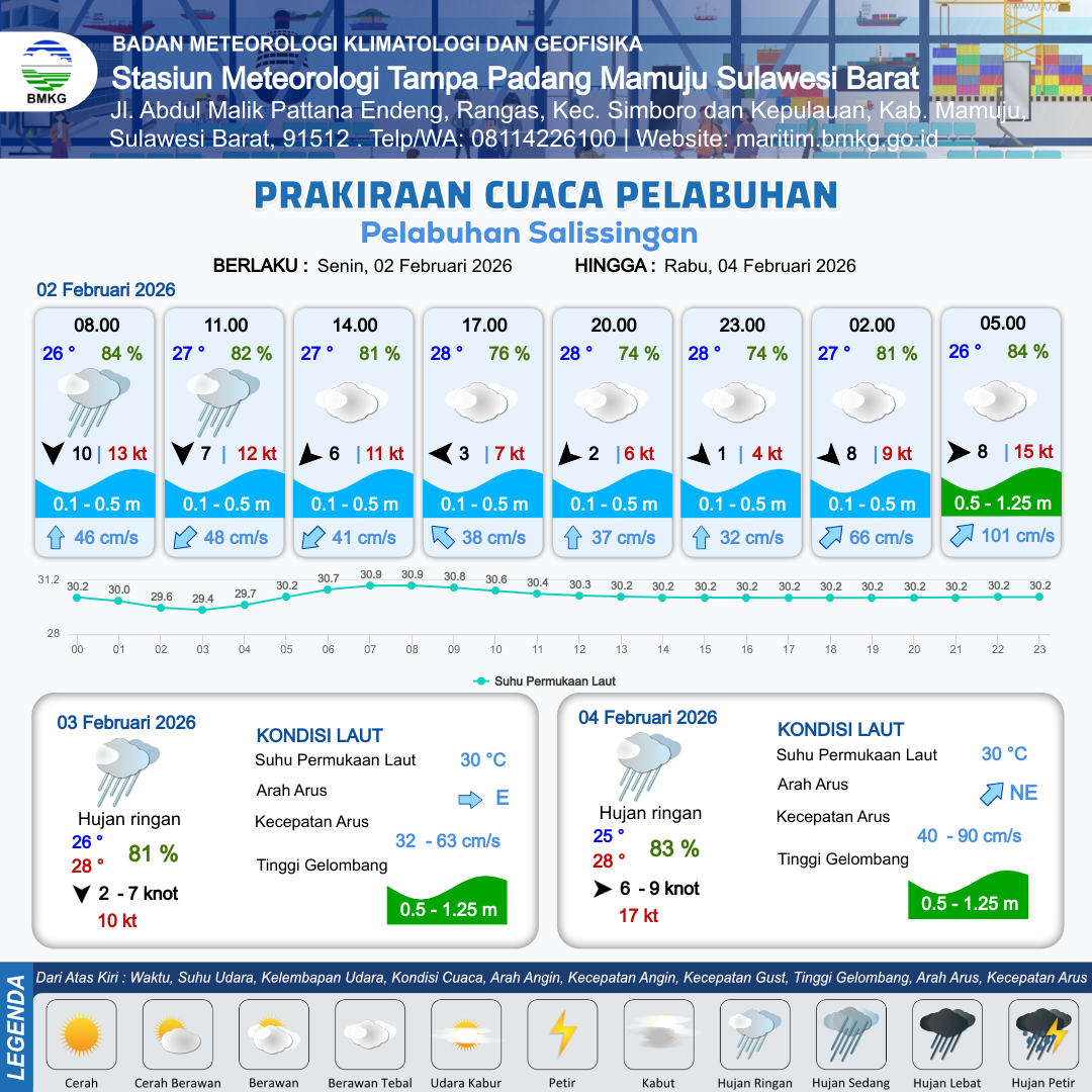 2 Feb 26, 14.00 9 jam kedepan | Barat 2 kt Gust Peningkatan kecepatan angin yang singkat dan tiba-tiba : 4 kt | 0.5 m Rendah | Timur Laut 48.0 cm/s | 10 km | 28 °C | 78 % | +0.23 m | |