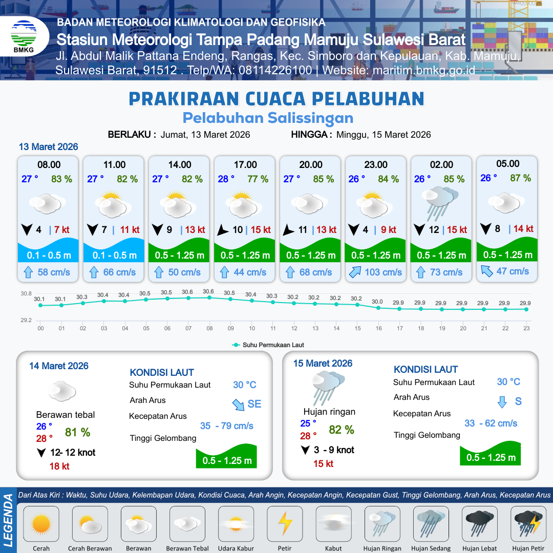 13 Mar 26, 18.00 2 jam kedepan | Barat Laut 11 kt Gust Peningkatan kecepatan angin yang singkat dan tiba-tiba : 14 kt | 0.9 m Rendah | Utara 97.0 cm/s | 8 km | 26 °C | 88 % | -0.34 m | |