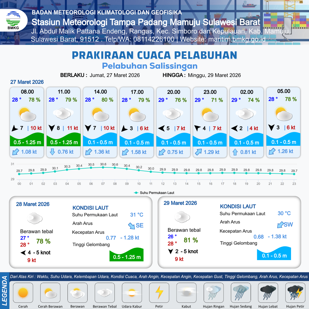 27 Mar 26, 15.00 6 jam kedepan | Tenggara 4 kt Gust Peningkatan kecepatan angin yang singkat dan tiba-tiba : 7 kt | 0.4 m Tenang | Timur Laut 0.9 Knot | 10 km | 28 °C | 77 % | -0.20 m | |