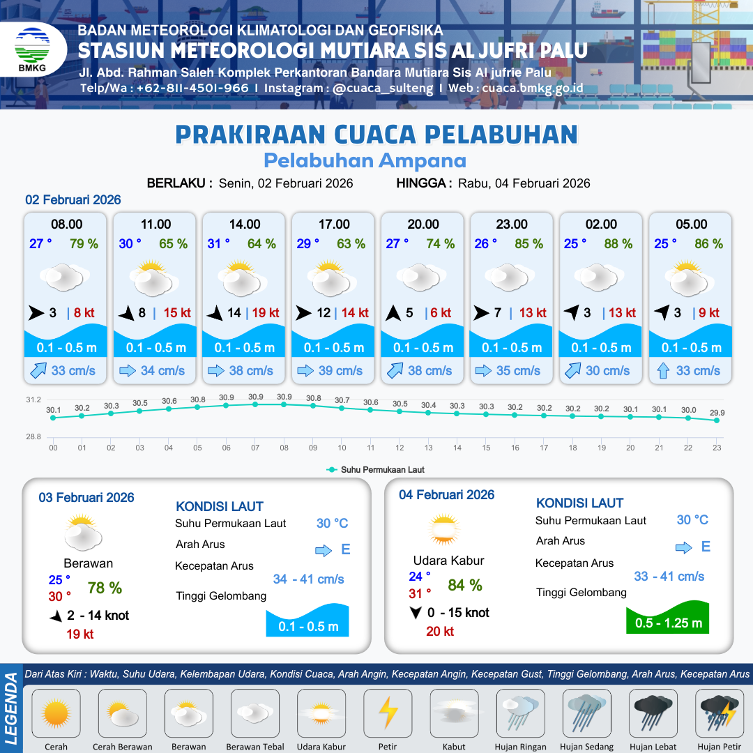 2 Feb 26, 23.00 5 jam kedepan | Cerah Berawan | Barat 2 kt Gust Peningkatan kecepatan angin yang singkat dan tiba-tiba : 6 kt | | | 10 km | 26 °C | 84 % | -0.04 m |