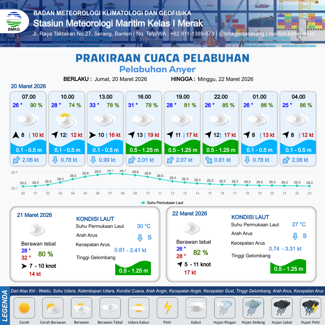 20 Mar 26, 08.00 7 jam kedepan | Barat Daya 13 kt Gust Peningkatan kecepatan angin yang singkat dan tiba-tiba : 19 kt | 0.5 m Rendah | Barat Daya 1.6 Knot | 10 km | 32 °C | 78 % | -0.29 m | |