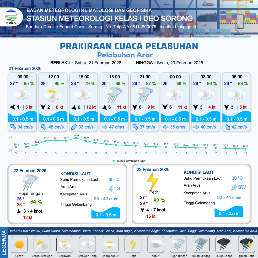 21 Feb 26, 23.00 3 jam kedepan | Hujan Ringan | Utara 4 kt Gust Peningkatan kecepatan angin yang singkat dan tiba-tiba : 8 kt | | | 9 km | 26 °C | 89 % | +0.47 m |
