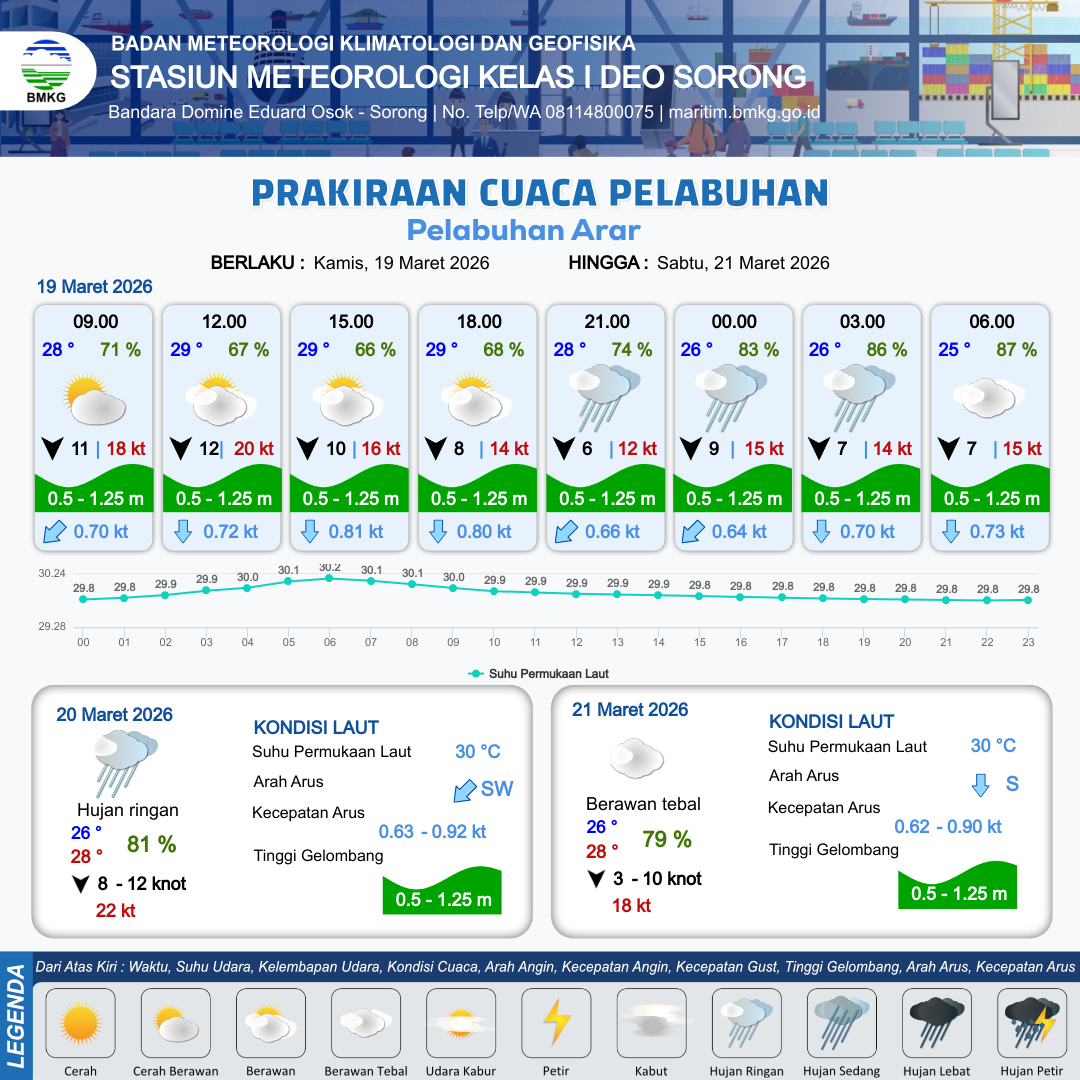 18 Mar 26, 08.00 12 jam yang lalu | Berawan Tebal | Utara 9 kt Gust Peningkatan kecepatan angin yang singkat dan tiba-tiba : 18 kt | | | 9 km | 27 °C | 79 % | +0.57 m |