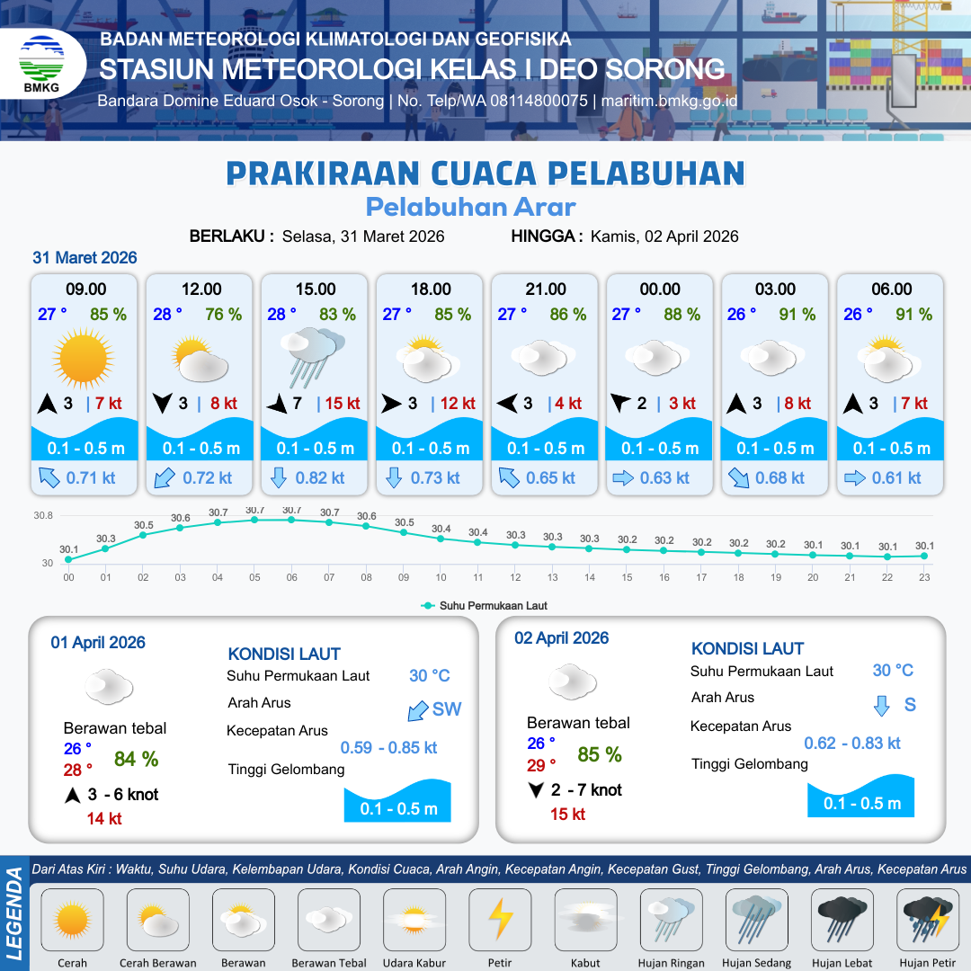 31 Mar 26, 12.00 2 jam kedepan | Timur 3 kt Gust Peningkatan kecepatan angin yang singkat dan tiba-tiba : 4 kt | 0.3 m Tenang | Utara 0.7 Knot | 7 km | 27 °C | 86 % | -0.05 m | |