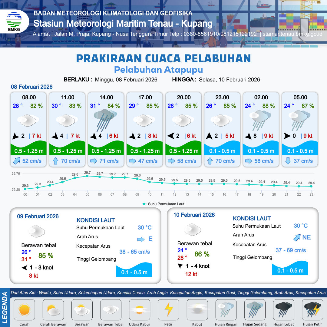 7 Feb 26, 23.00 6 jam kedepan | Berawan Tebal | Timur 5 kt Gust Peningkatan kecepatan angin yang singkat dan tiba-tiba : 7 kt | | | 10 km | 26 °C | 85 % | -0.24 m |