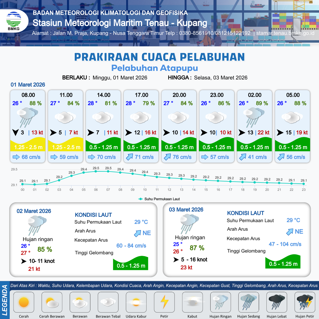 1 Mar 26, 22.00 4 jam kedepan | Hujan Ringan | Barat 15 kt Gust Peningkatan kecepatan angin yang singkat dan tiba-tiba : 20 kt | | | 6 km | 26 °C | 88 % | -0.91 m |