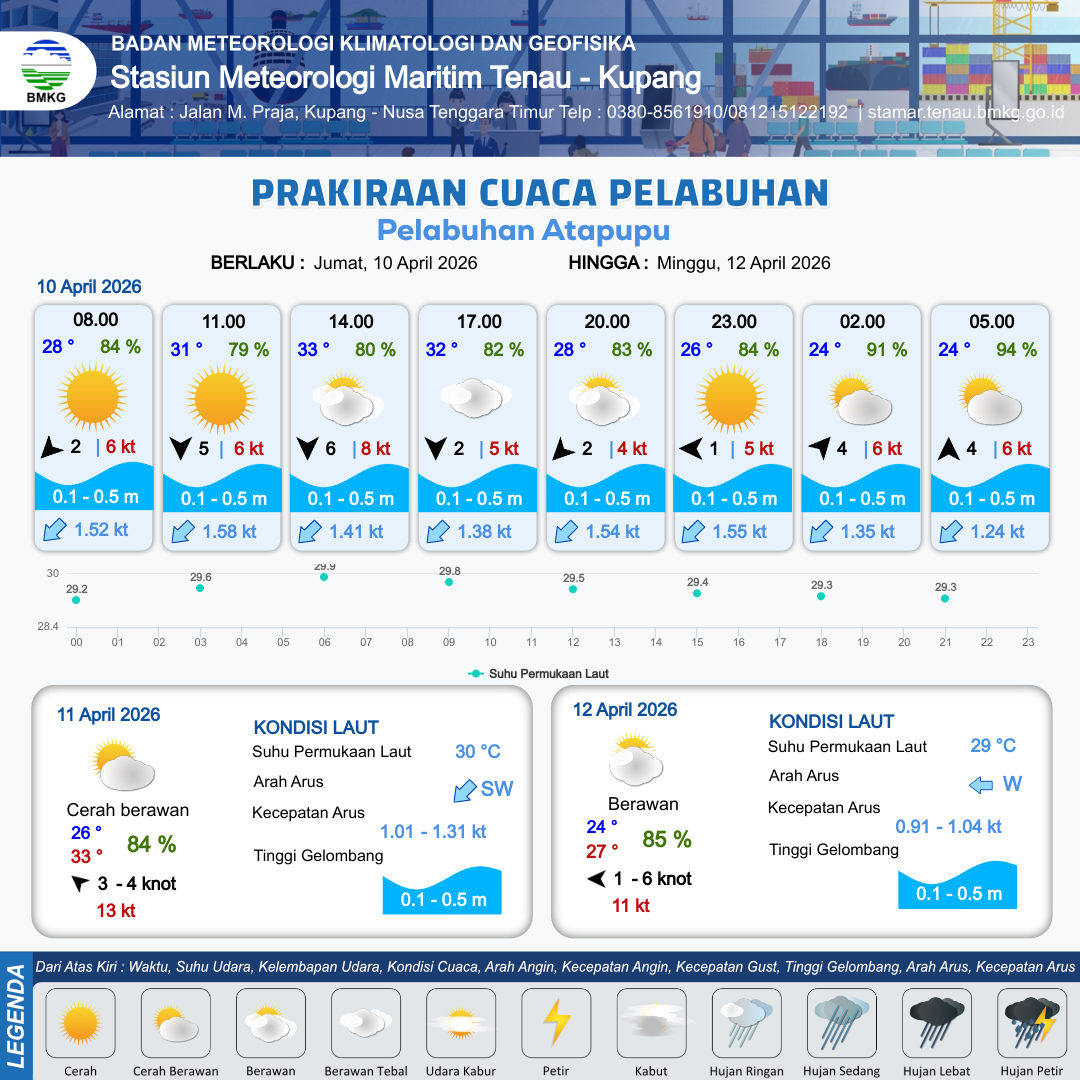 10 Apr 26, 17.00 2 jam yang lalu | Cerah Berawan | Barat Daya 4 kt Gust Peningkatan kecepatan angin yang singkat dan tiba-tiba : 5 kt | | | 8 km | 25 °C | 89 % | +0.55 m |