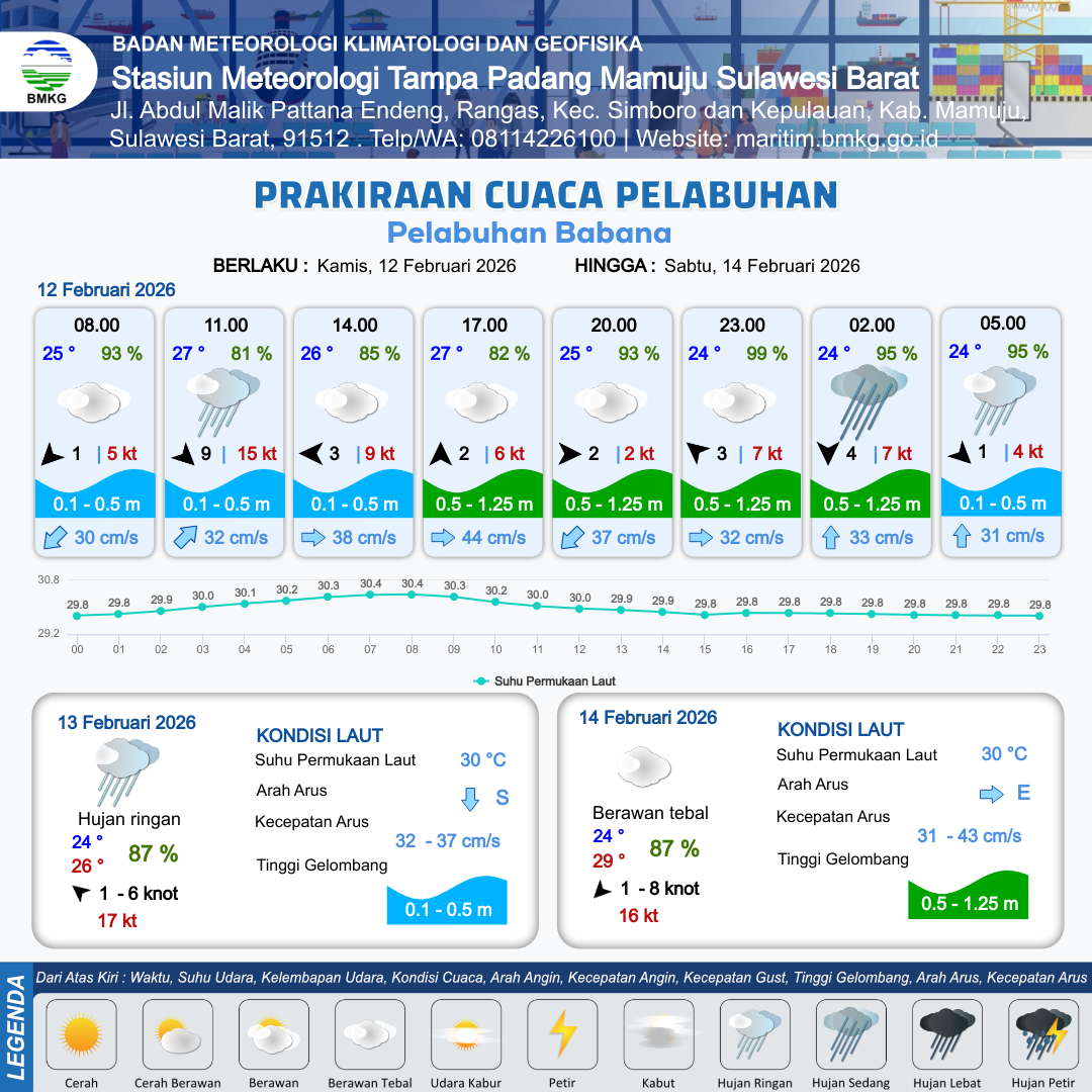 12 Feb 26, 13.00 13 jam kedepan | Barat 2 kt Gust Peningkatan kecepatan angin yang singkat dan tiba-tiba : 3 kt | 0.8 m Rendah | Timur 35.0 cm/s | 9 km | 25 °C | 95 % | +0.14 m | |