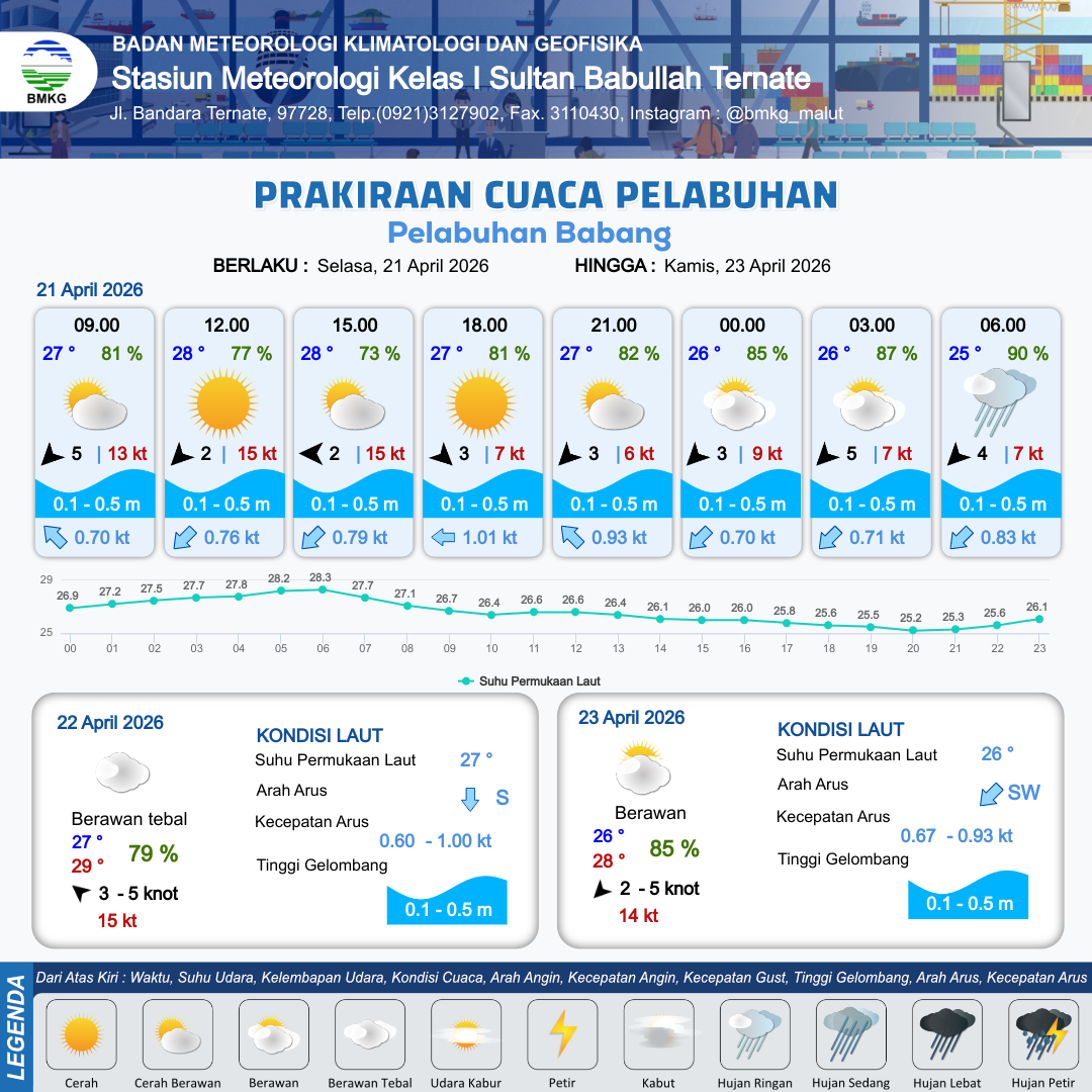 21 Apr 26, 07.00 4 jam kedepan | Timur 2 kt Gust Peningkatan kecepatan angin yang singkat dan tiba-tiba : 12 kt | 0.1 m Tenang | Barat 0.9 Knot | 9 km | 28 °C | 75 % | -0.08 m | |