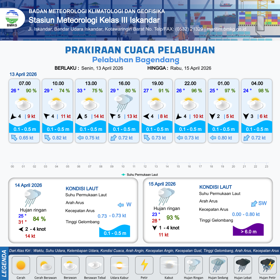 13 Apr 26, 07.00 4 jam kedepan | Selatan 5 kt Gust Peningkatan kecepatan angin yang singkat dan tiba-tiba : 14 kt | 0.3 m Tenang | Barat 0.8 Knot | 9 km | 32 °C | 76 % | +0.53 m | |