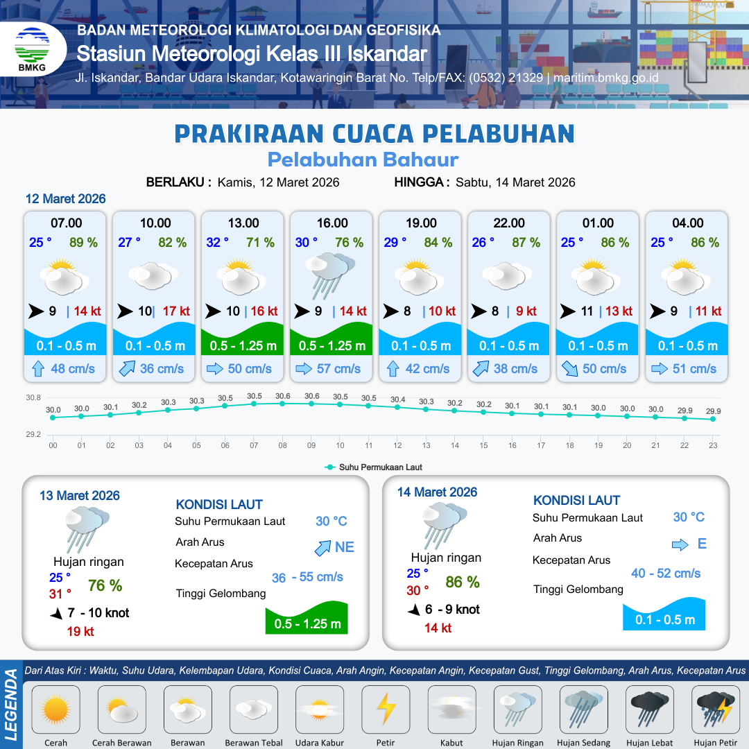 11 Mar 26, 08.00 12 jam yang lalu | Berawan | Barat 12 kt Gust Peningkatan kecepatan angin yang singkat dan tiba-tiba : 18 kt | | | 10 km | 30 °C | 74 % | +0.27 m |
