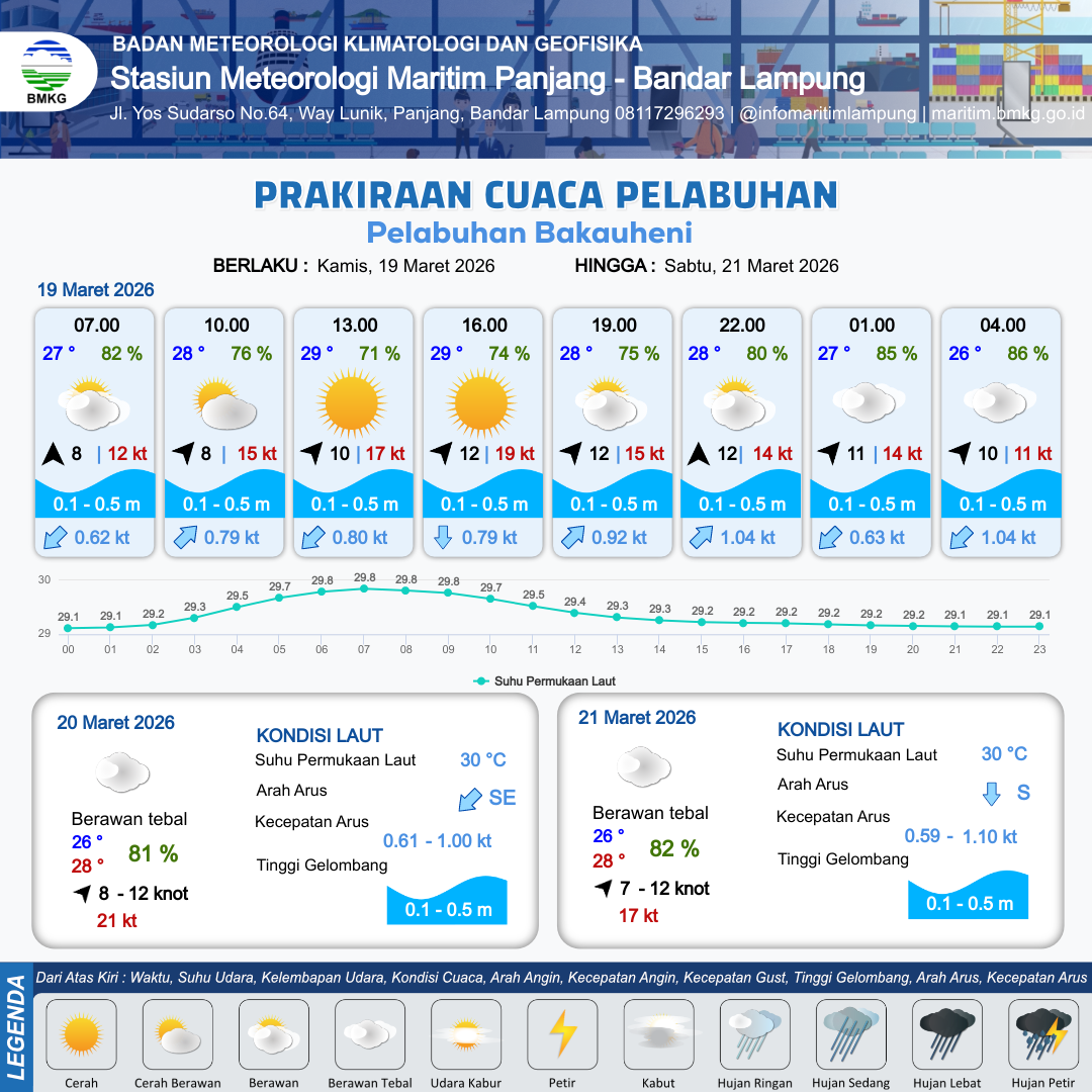19 Mar 26, 21.00 3 jam kedepan | Berawan Tebal | Barat Daya 10 kt Gust Peningkatan kecepatan angin yang singkat dan tiba-tiba : 11 kt | | | 10 km | 26 °C | 86 % | +0.22 m |