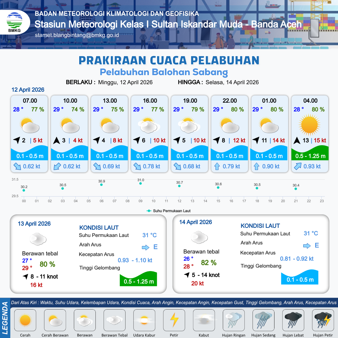 12 Apr 26, 15.00 3 jam kedepan | Barat Daya 8 kt Gust Peningkatan kecepatan angin yang singkat dan tiba-tiba : 12 kt | 0.4 m Tenang | Utara 0.8 Knot | 10 km | 29 °C | 80 % | +0.53 m | |