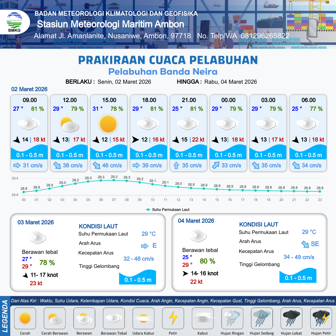 2 Mar 26, 20.00 3 jam kedepan | Berawan Tebal | Barat Laut 13 kt Gust Peningkatan kecepatan angin yang singkat dan tiba-tiba : 18 kt | | | 10 km | 26 °C | 79 % | -0.14 m |
