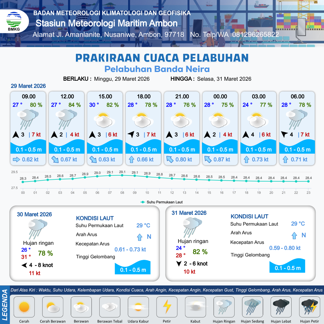 29 Mar 26, 23.00 3 jam kedepan | Cerah Berawan | Timur 6 kt Gust Peningkatan kecepatan angin yang singkat dan tiba-tiba : 9 kt | | | 10 km | 28 °C | 77 % | -0.54 m |