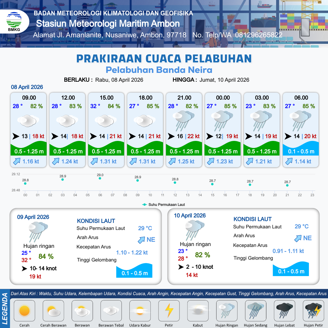 9 Apr 26, 08.00 10 jam kedepan | Barat 14 kt Gust Peningkatan kecepatan angin yang singkat dan tiba-tiba : 22 kt | 0.8 m Rendah | Timur Laut 1.5 Knot | 6 km | 29 °C | 83 % | +0.70 m | |