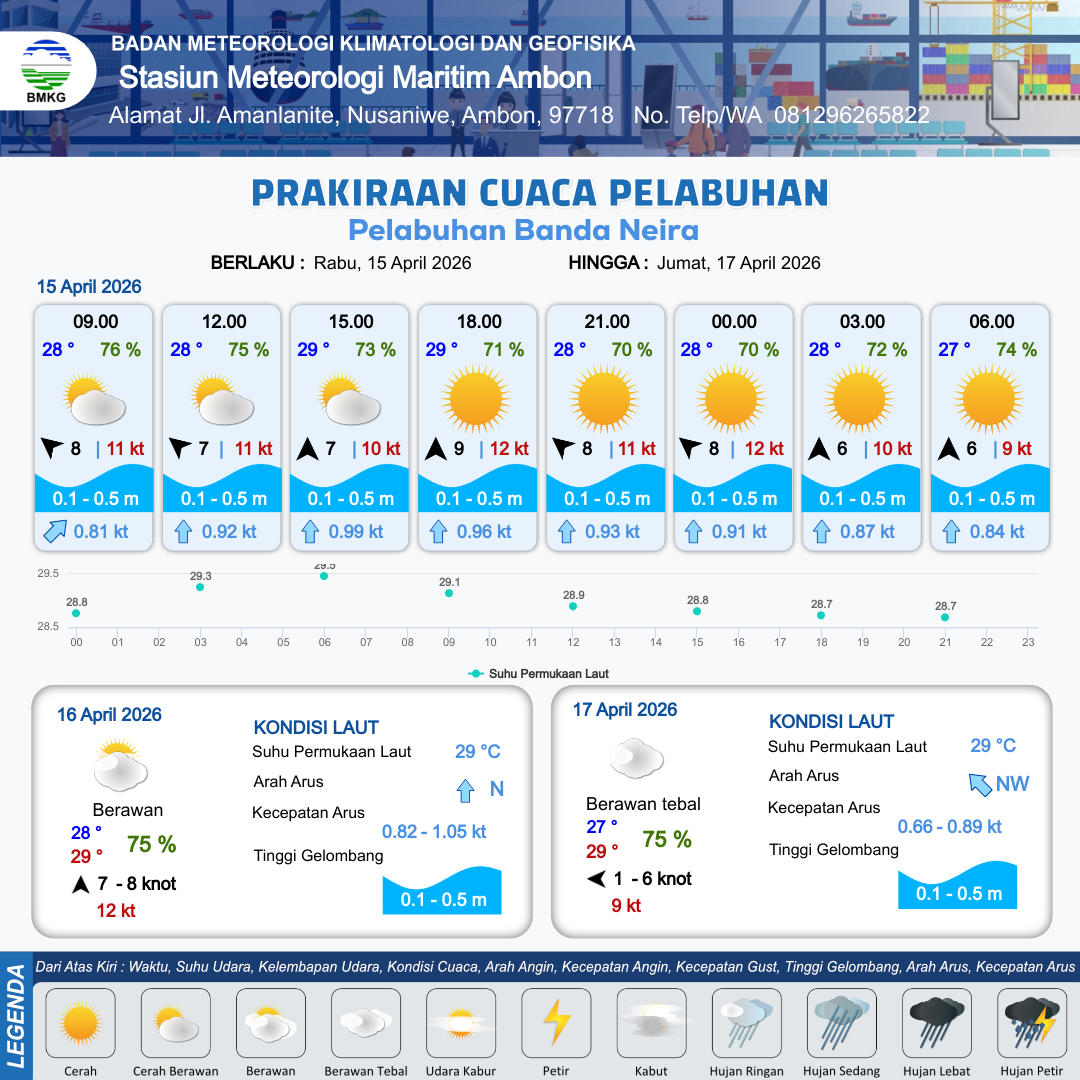 15 Apr 26, 15.00 9 jam kedepan | Tenggara 8 kt Gust Peningkatan kecepatan angin yang singkat dan tiba-tiba : 12 kt | 0.4 m Tenang | Utara 0.9 Knot | 10 km | 28 °C | 70 % | +0.65 m | |