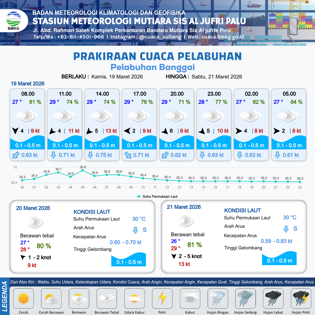 19 Mar 26, 18.00 9 jam kedepan | Barat 4 kt Gust Peningkatan kecepatan angin yang singkat dan tiba-tiba : 8 kt | 0.1 m Tenang | Selatan 0.6 Knot | 10 km | 27 °C | 82 % | +0.75 m | |