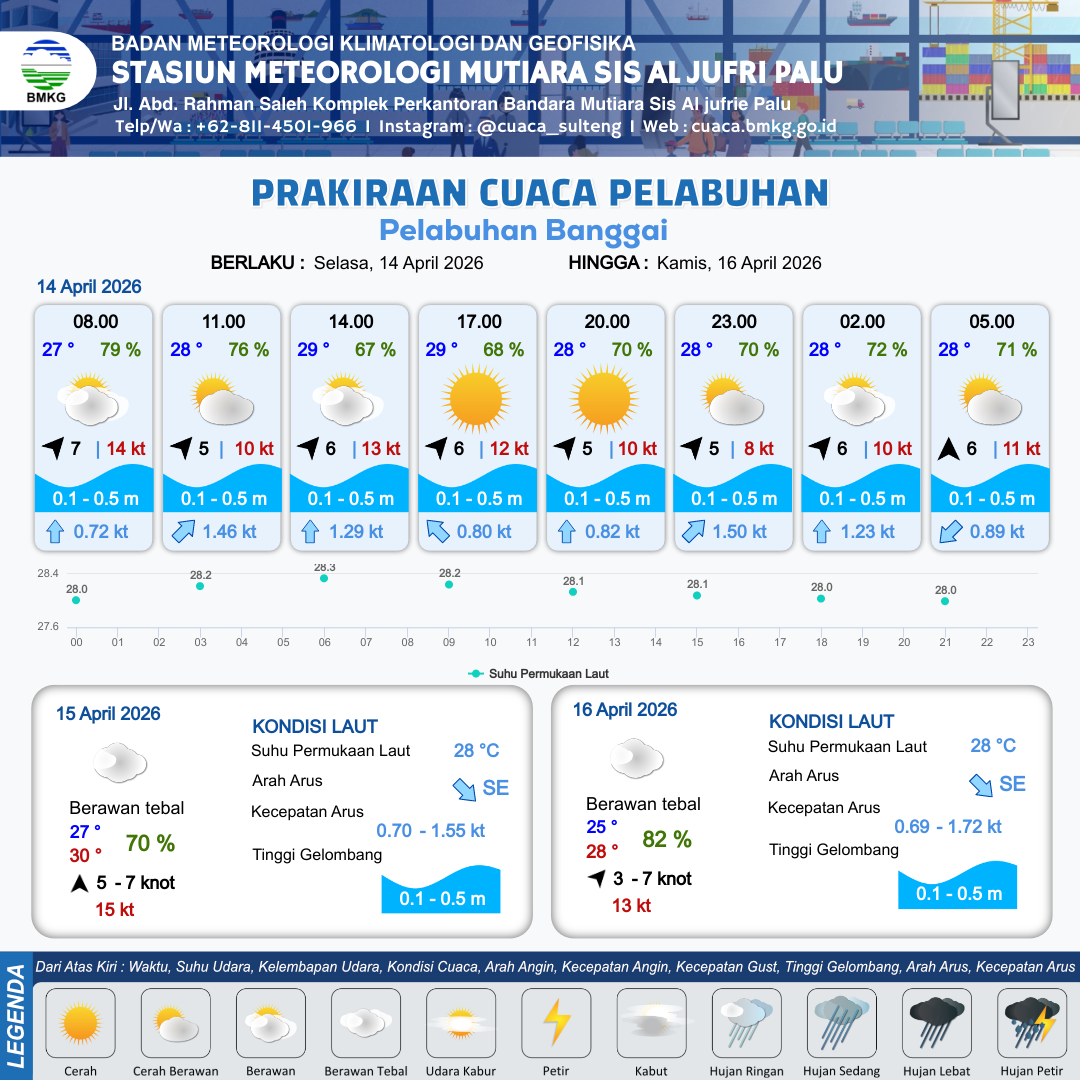 14 Apr 26, 06.00 4 jam kedepan | Barat Daya 6 kt Gust Peningkatan kecepatan angin yang singkat dan tiba-tiba : 13 kt | 0.4 m Tenang | Utara 1.3 Knot | 10 km | 29 °C | 67 % | +0.63 m | |