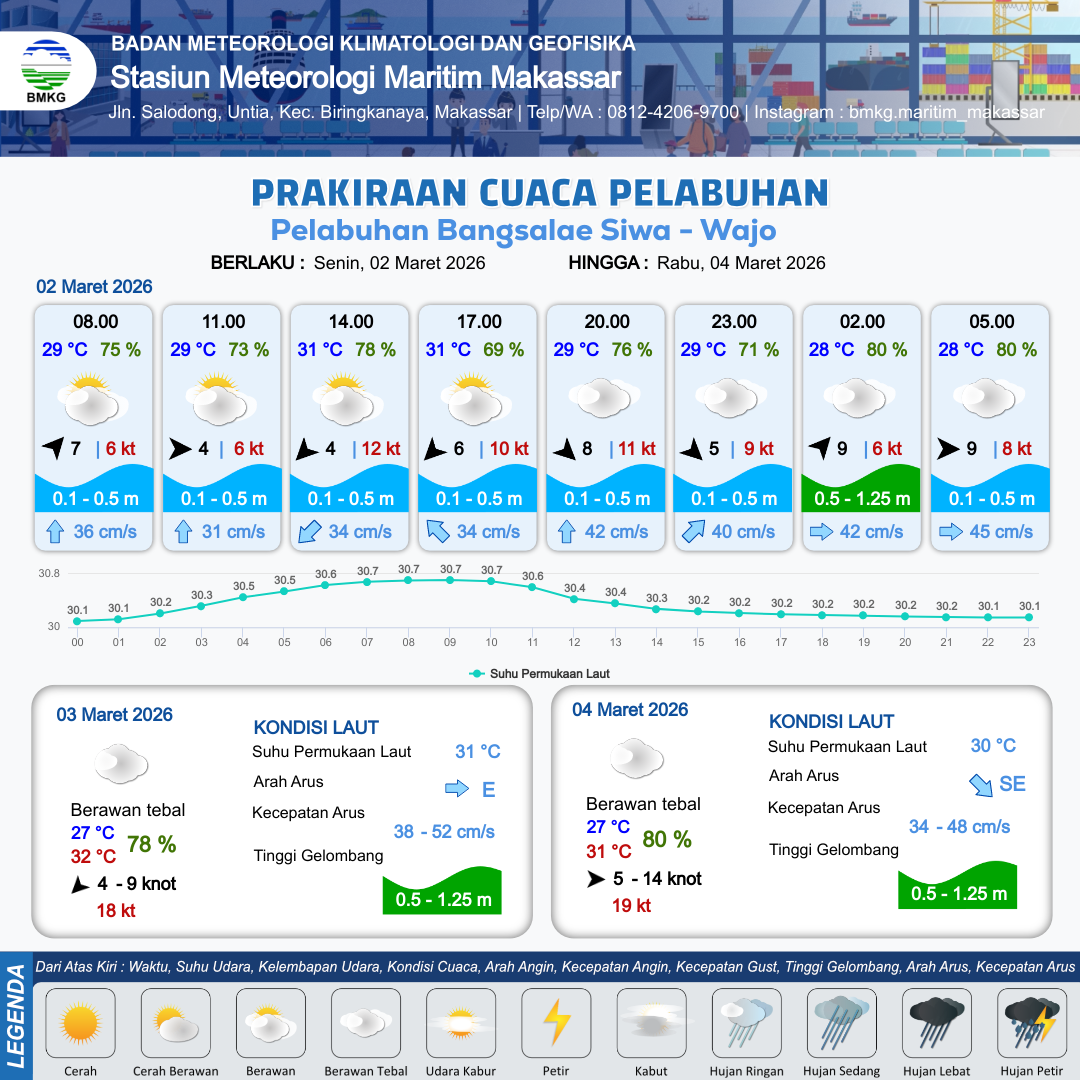 2 Mar 26, 18.00 4 jam kedepan | Barat Daya 9 kt Gust Peningkatan kecepatan angin yang singkat dan tiba-tiba : 6 kt | 0.6 m Rendah | Timur 42.0 cm/s | 10 km | 29 °C | 80 % | +0.71 m | |