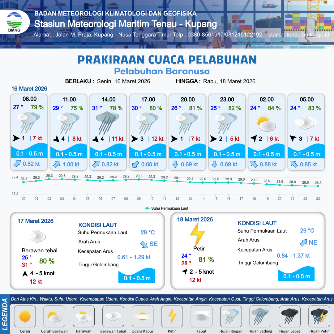 16 Mar 26, 04.00 16 jam yang lalu | Hujan Sedang | Barat Laut 4 kt Gust Peningkatan kecepatan angin yang singkat dan tiba-tiba : 8 kt | | | 8 km | 29 °C | 75 % | +0.57 m |