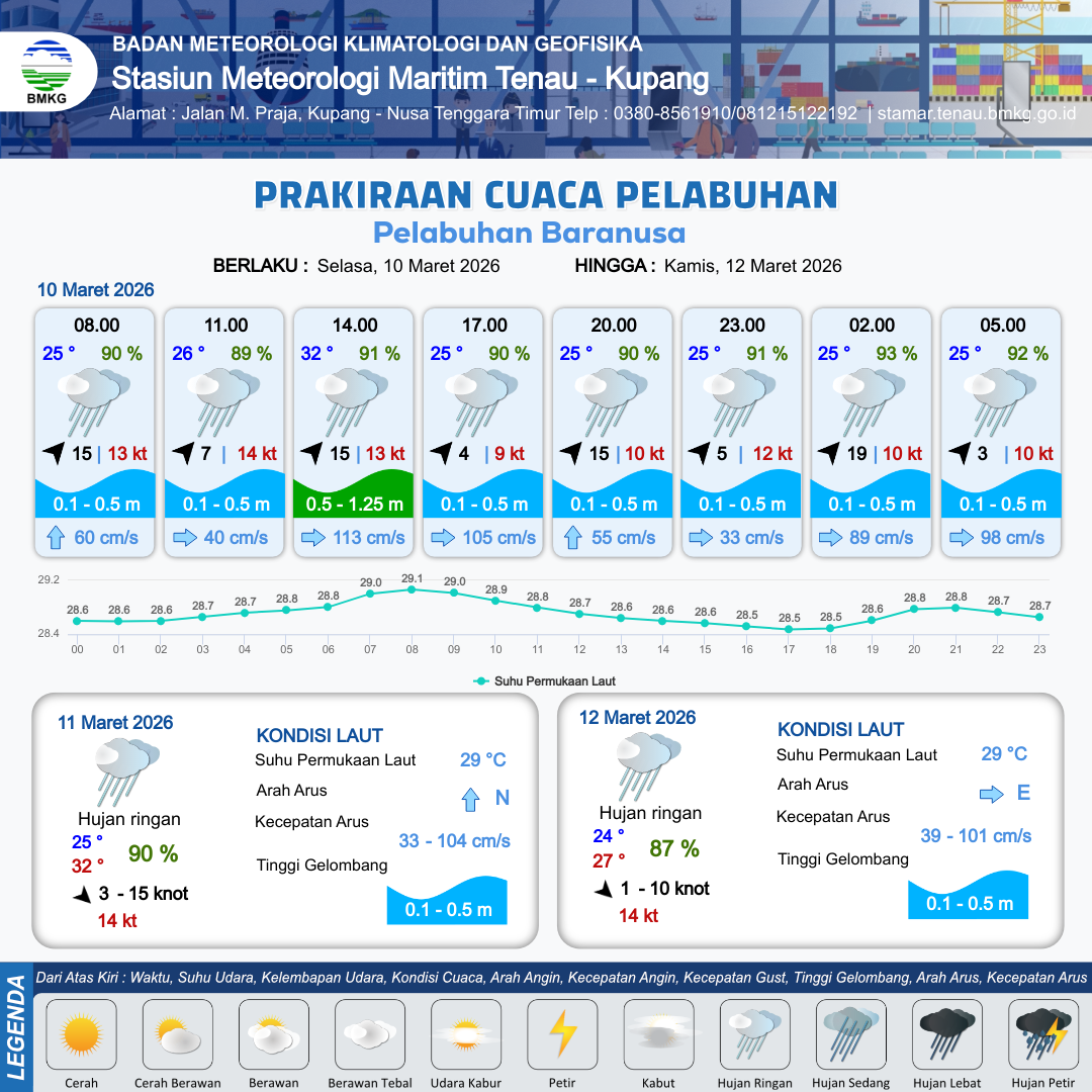 10 Mar 26, 06.00 8 jam kedepan | Barat Daya 15 kt Gust Peningkatan kecepatan angin yang singkat dan tiba-tiba : 13 kt | 0.6 m Rendah | Timur 113.0 cm/s | 8 km | 32 °C | 91 % | +0.29 m | |