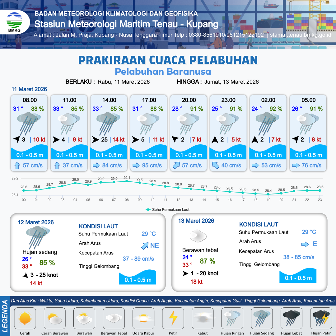 11 Mar 26, 03.00 3 jam kedepan | Barat 4 kt Gust Peningkatan kecepatan angin yang singkat dan tiba-tiba : 9 kt | 0.3 m Tenang | Utara 37.0 cm/s | 6 km | 33 °C | 85 % | -0.32 m | |