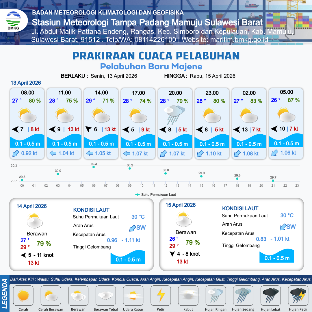 13 Apr 26, 22.00 3 jam kedepan | Cerah Berawan | Timur 10 kt Gust Peningkatan kecepatan angin yang singkat dan tiba-tiba : 6 kt | | | 9 km | 26 °C | 87 % | - m |
