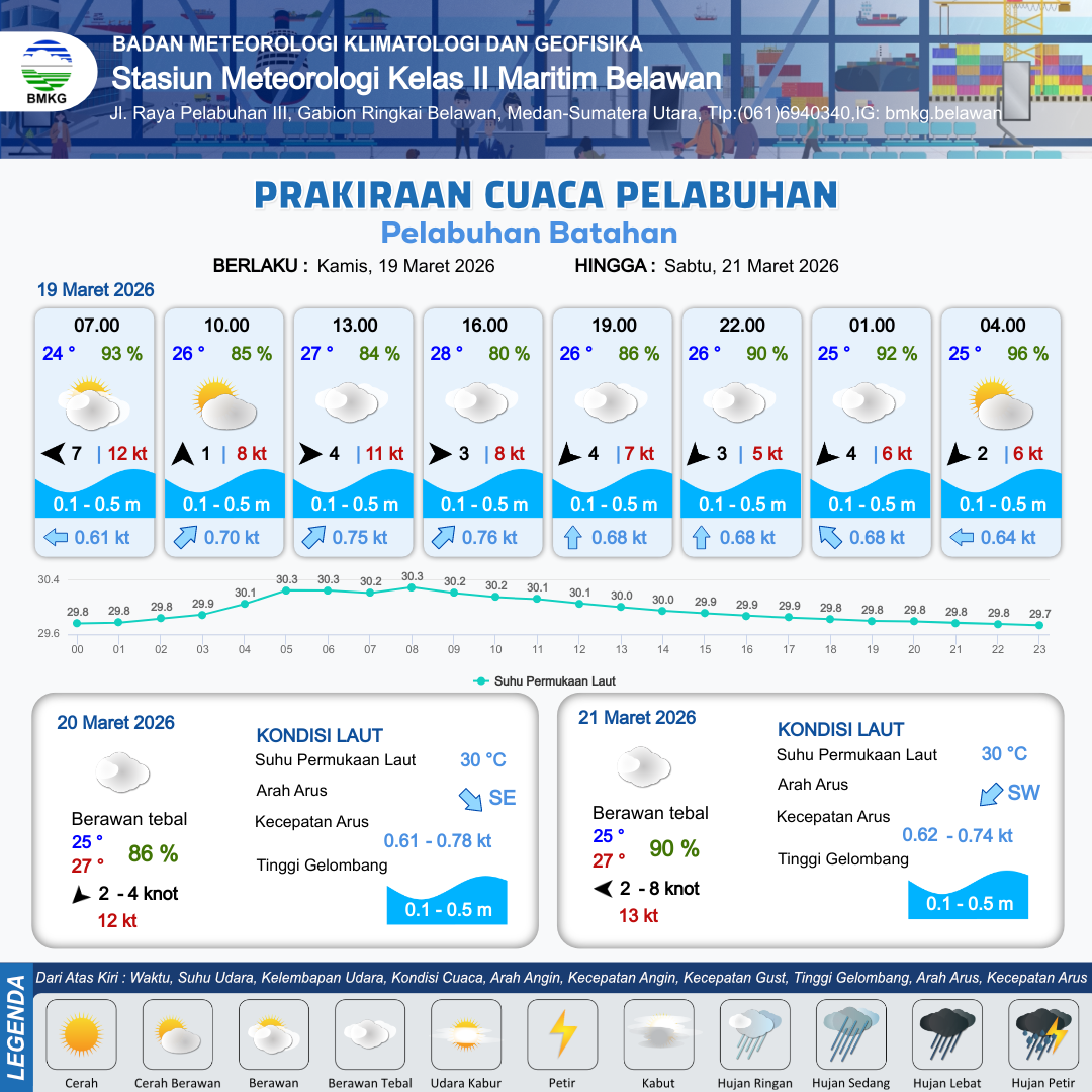19 Mar 26, 09.00 2 jam kedepan | Barat 3 kt Gust Peningkatan kecepatan angin yang singkat dan tiba-tiba : 8 kt | 0.1 m Tenang | Timur Laut 0.8 Knot | 10 km | 28 °C | 80 % | +0.18 m | |