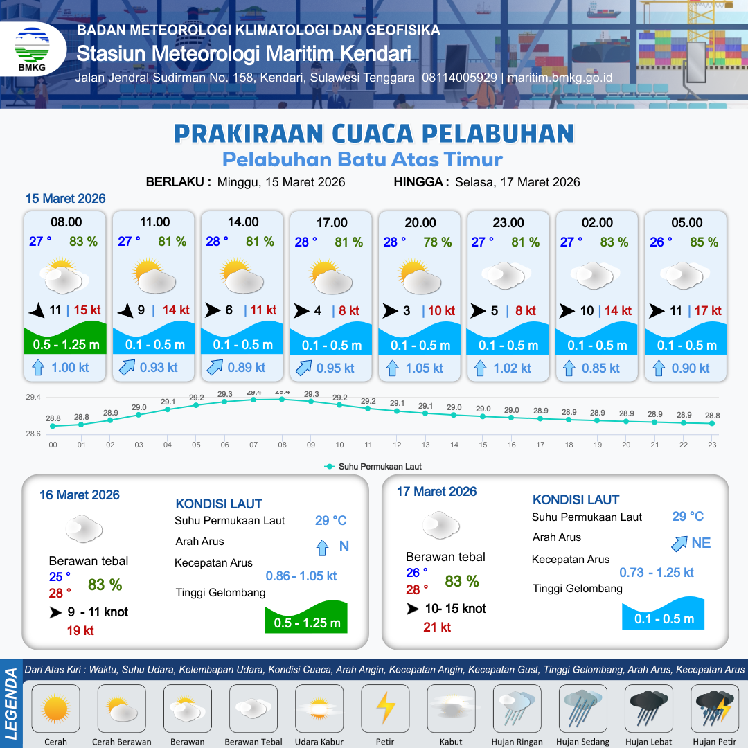 15 Mar 26, 21.00 4 jam kedepan | Berawan Tebal | Barat 11 kt Gust Peningkatan kecepatan angin yang singkat dan tiba-tiba : 17 kt | | | 8 km | 26 °C | 85 % | -0.61 m |