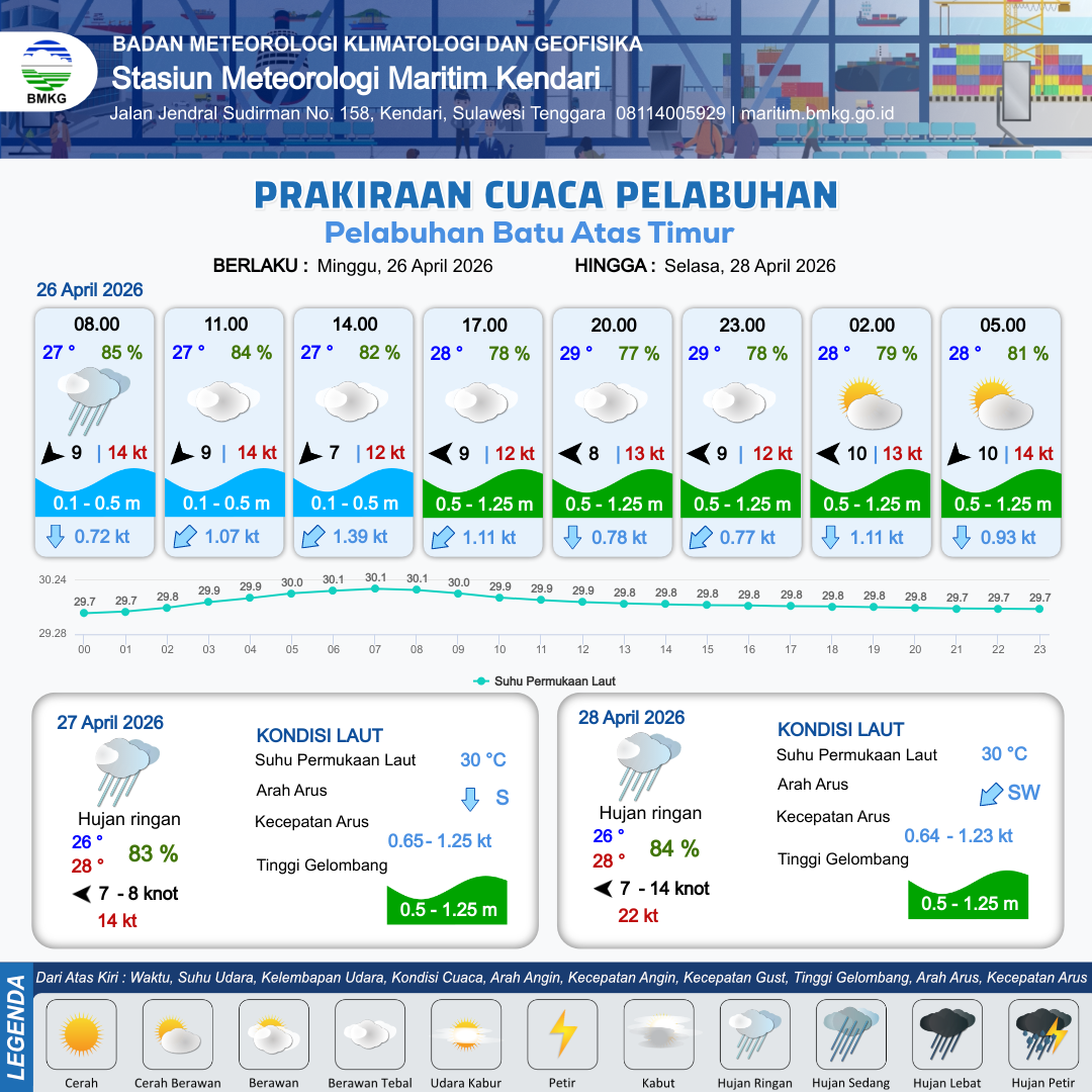 24 Apr 26, 04.00 14 jam yang lalu | Cerah Berawan | Timur 12 kt Gust Peningkatan kecepatan angin yang singkat dan tiba-tiba : 15 kt | | | 10 km | 29 °C | 81 % | -0.30 m |