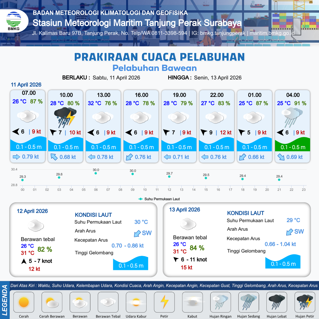 11 Apr 26, 23.00 7 jam kedepan | Selatan 7 kt Gust Peningkatan kecepatan angin yang singkat dan tiba-tiba : 10 kt | 0.5 m Rendah | Timur 0.7 Knot | 10 km | 26 °C | 89 % | +0.55 m |