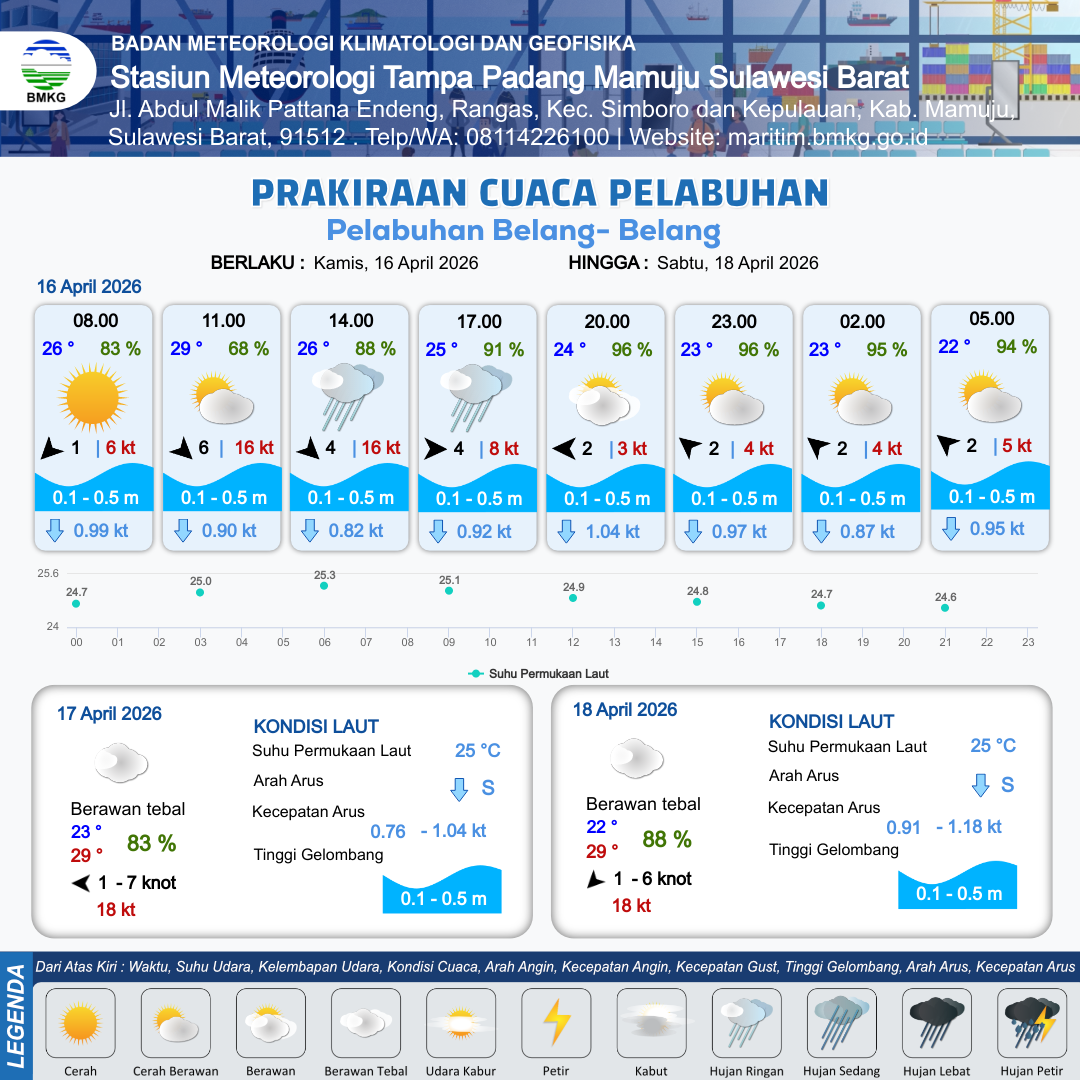 16 Apr 26, 10.00 12 jam kedepan | Barat 4 kt Gust Peningkatan kecepatan angin yang singkat dan tiba-tiba : 8 kt | 0.3 m Tenang | Selatan 0.9 Knot | 9 km | 24 °C | 95 % | +0.50 m | |