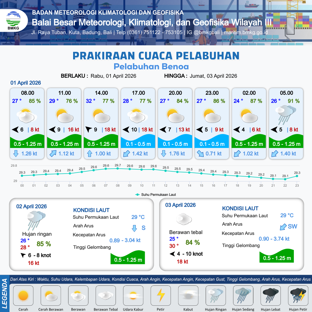 1 Apr 26, 03.00 15 jam yang lalu | Cerah Berawan | Timur 9 kt Gust Peningkatan kecepatan angin yang singkat dan tiba-tiba : 16 kt | | | 10 km | 29 °C | 76 % | +0.59 m |